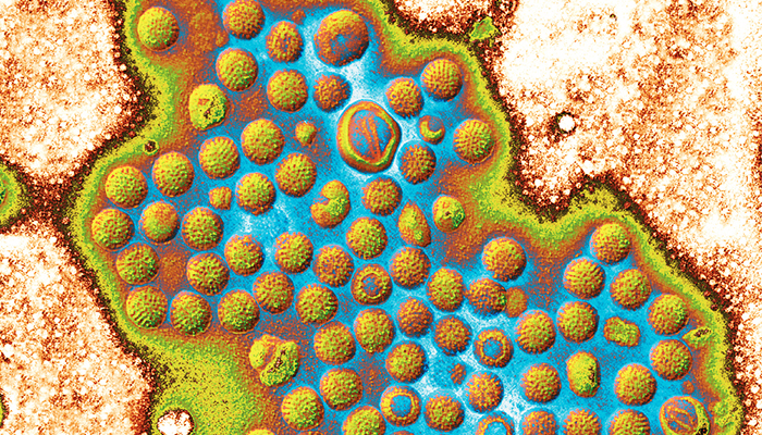 Behüllte Viren sind Influenza, Hepatitis B und C, HIV, Herpes und natürlich Coronaviren (Bild).