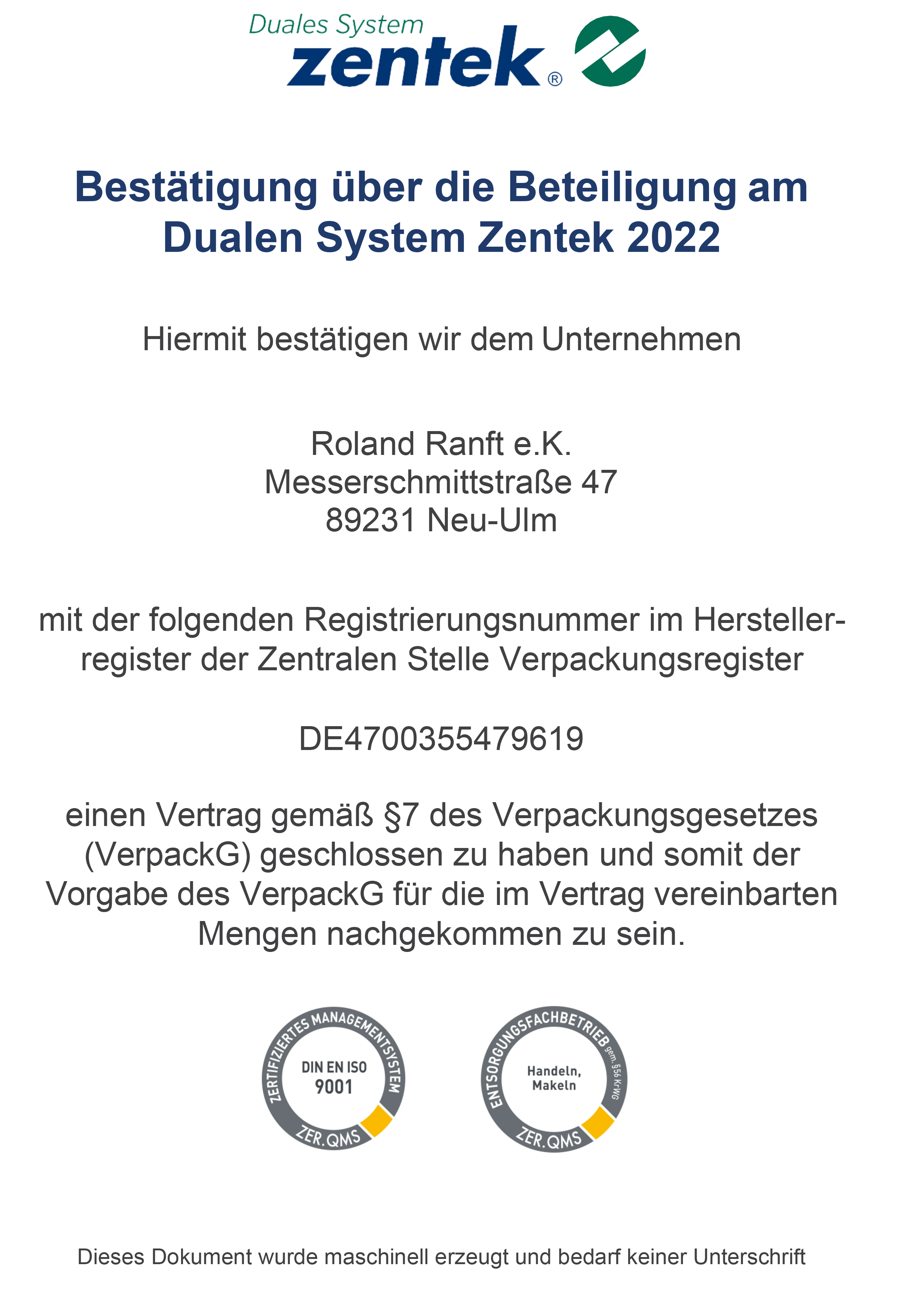 Ranft ist als Hersteller/ Erstinverkehrbringer im Verpackungsregister LUCID unter der Nummer DE4700355479619 registriert.
