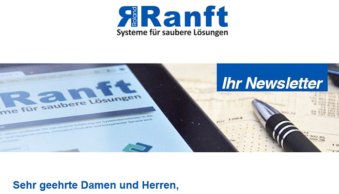 Melden Sie sich für den Ranft Newsletter an und erhalten Sie regelmäßig exklusive Angebote, Neuigkeiten zu Ranft und zur Reinigungs- und Hygienebranche.